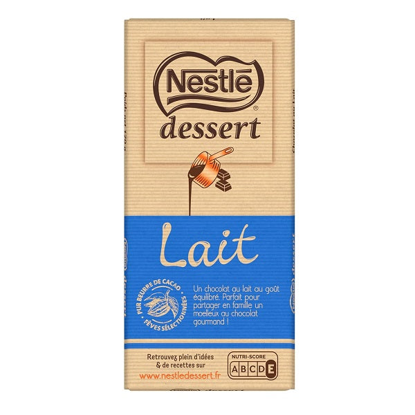 NESTLE DESSERT Lait est un chocolat au lait pur beurre de cacao à la fonte parfaite, aux arômes naturels de vanille et préparé avec soin à partir de fèves sélectionnées. Idéal pour partager en famille un fondant au chocolat gourmand ! Avec le Plan Cacao, Nestlé soutient les cultivateurs pour améliorer la qualité de leur cacao.
