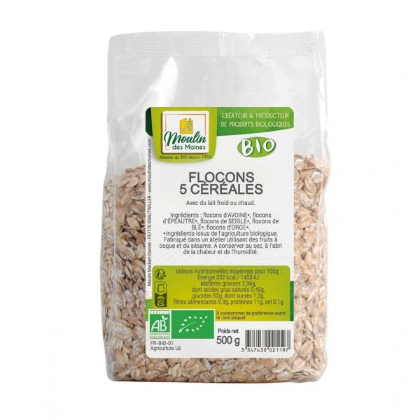 Composez vos mueslis selon vos envies avec ces flocons 5 céréales bio. Ils pourront servir d'accompagnement cuits ou utilisés dans des farces, bouillies, et pour les croquettes. Ces flocons sont également recommandés pour les potages et les porridges. Démarrer la cuisson dans 2 volumes d'eau pour 1 volume de flocons, laisser cuire 5 minutes après ébullition.