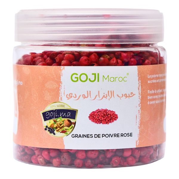 Les "Graines de poivre rose" (حبوب الإبزار الوردي) proviennent du faux-poivrier (Schinus molle ou Schinus terebinthifolia). Contrairement au poivre noir, le poivre rose n'est pas un vrai poivre mais est largement utilisé comme épice pour son goût délicat et légèrement sucré.